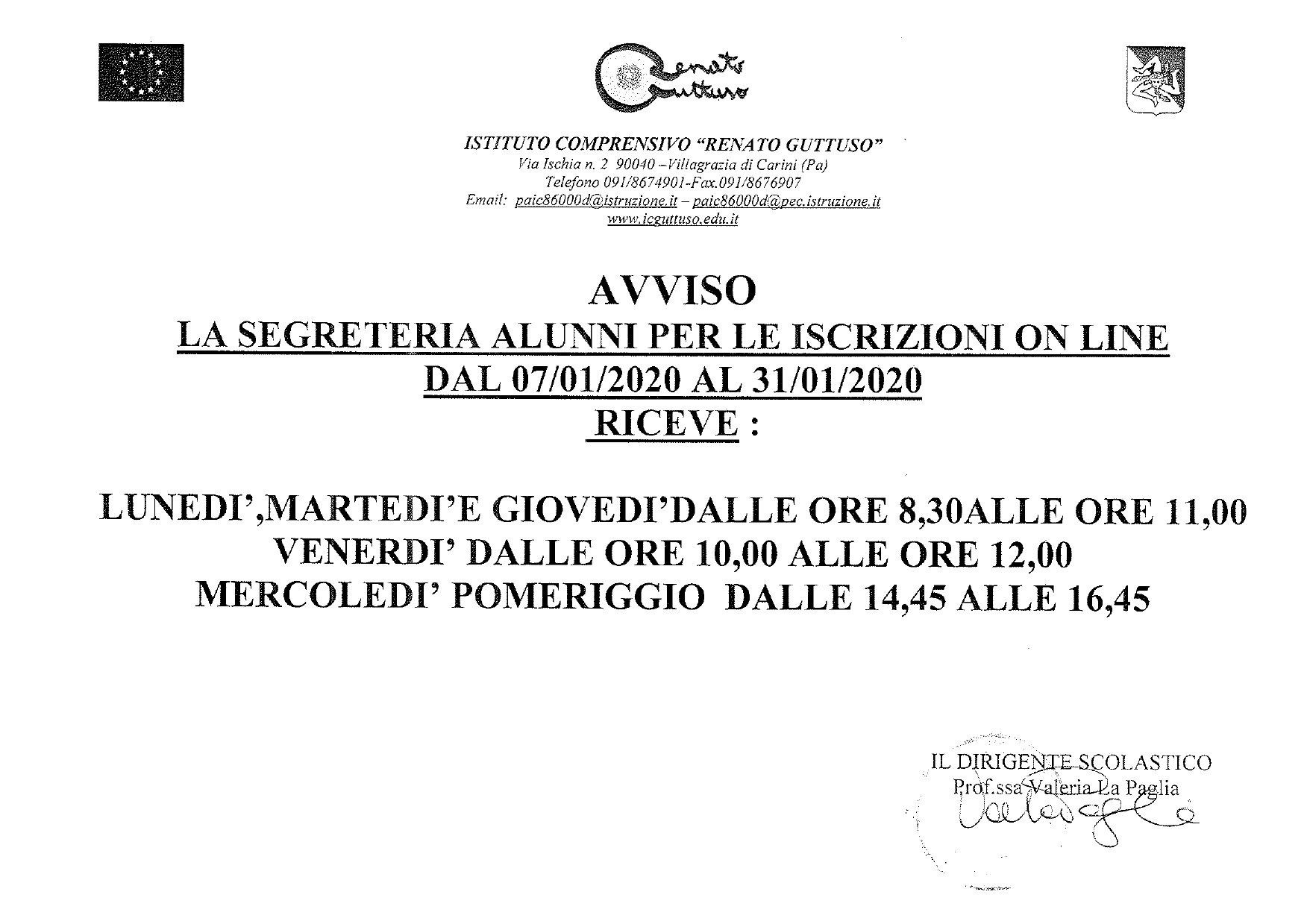 AVVISO Ricevimento Segreteria Alunni per Iscrizioni Anno Scolastico 2020/2021